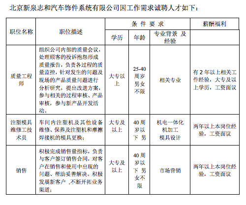 北京新泉志和汽车饰件系统有限公司招聘简章