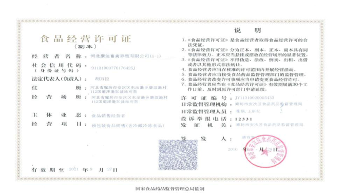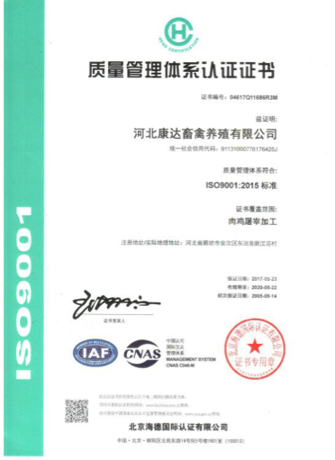 公司先后被评为河北省农业产业化重点龙头企业、国家级农业产业化重点龙头企业、全国农产品加工示范企业、全国畜牧业百强优秀企业等荣誉称号,公司产品主要销往京、津、沪等国内各大省市,公司生产的“康达基”系列产品被评为河北省名牌产品、并获得了河北省著名商标等荣誉称号。