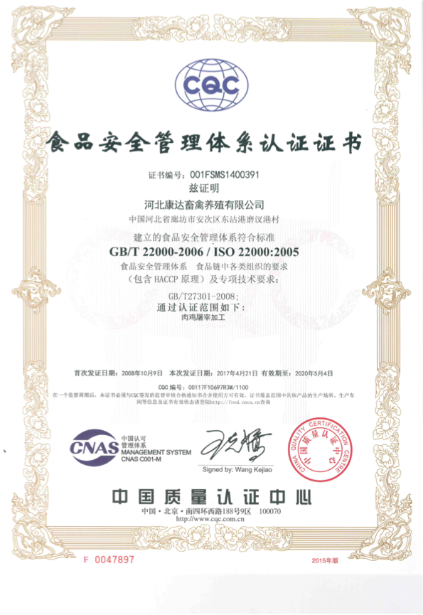 五、公司秉承“健康为基”的精神,在产品生产过程中,严格执行SSOP、SOP、HACCP操作规范,把控产品质量,分别通过认证ISO 22000、ISO 9001。每年为社会提供优质的鸡肉产品9万吨。