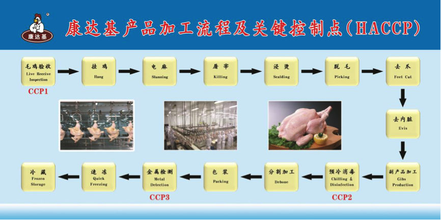 四、公司食品加工厂引进了国内先进的全套肉鸡屠宰分割流水线。“康达基”品牌鸡肉产品以“健康、新鲜、营养、安全”受到业内及广大消费者的一致好评。