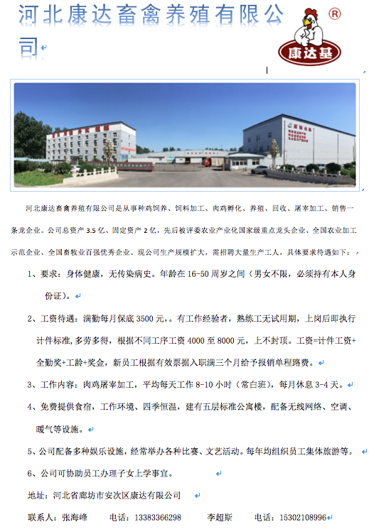 一、河北康达畜禽养殖有限公司2003年3月注册成立,注册资金5000万元,位于河北省廊坊市安次区东沽港镇西112国道旁。公司是集饲料加工、种鸡饲养,肉鸡孵化、养殖、屠宰加工、冷藏配送及销售为一体的现代化肉鸡全产业企业。现已实现年孵化肉鸡4000万羽、年屠宰加工肉鸡4000万只、年产饲料30万吨。